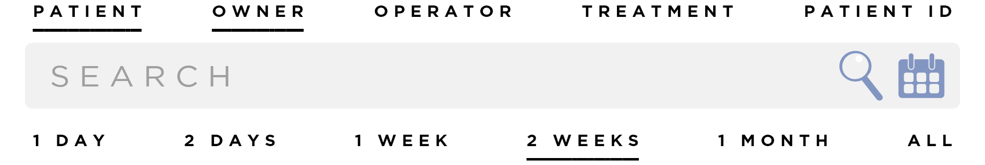 You can search for existing patients using a variety of search criteria provided in our search control including, Patient, Operator, Treatment, and Patient Id.