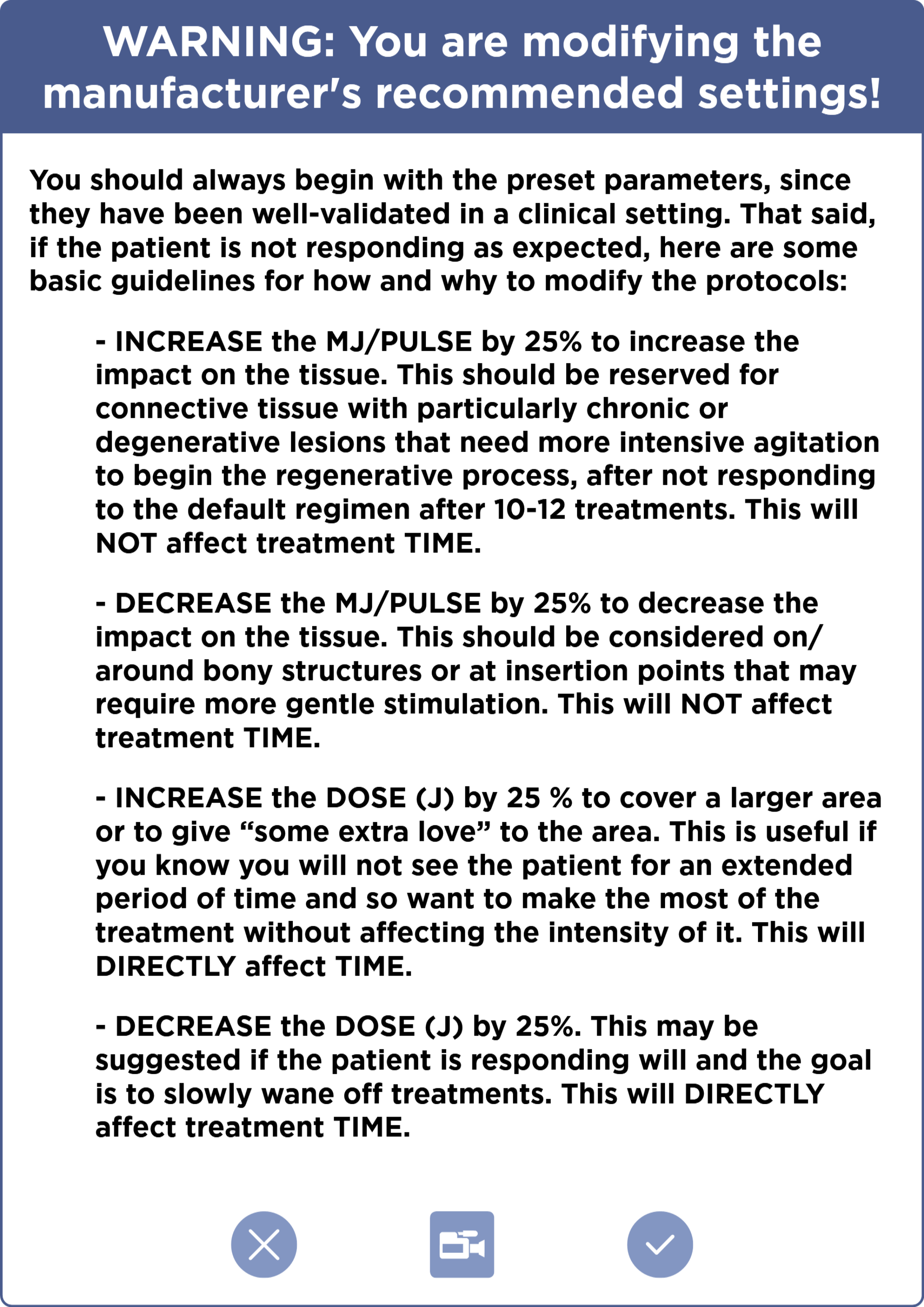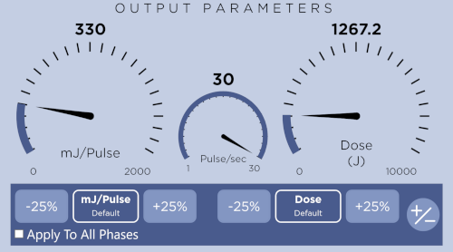 Once you have acknowledged the warning, you will be able to adjust the mJ/Pulse and the Dose of the selected Phase. You can Increase each by at most 25%. The output parameters will automatically adjust.